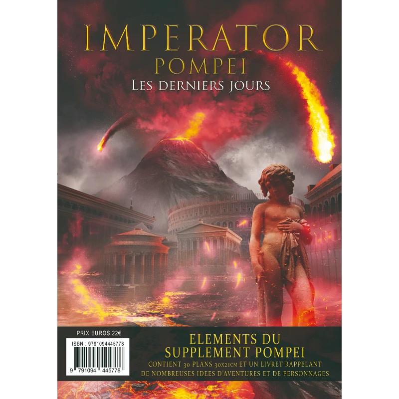 Ce supplément pour IMPERATOR, le JDR de la Rome antique, rassemble tous les éléments du supplément Pompei nécessaires pour jouer dans les meilleures conditions. Le pack contient toutes les informations vitales du supplément sous forme d’un livret, ainsi que trente plans 30x21cm, détaillant tous les types de bâtiments que l’on peut rencontrer dans celle ville romaine typique.