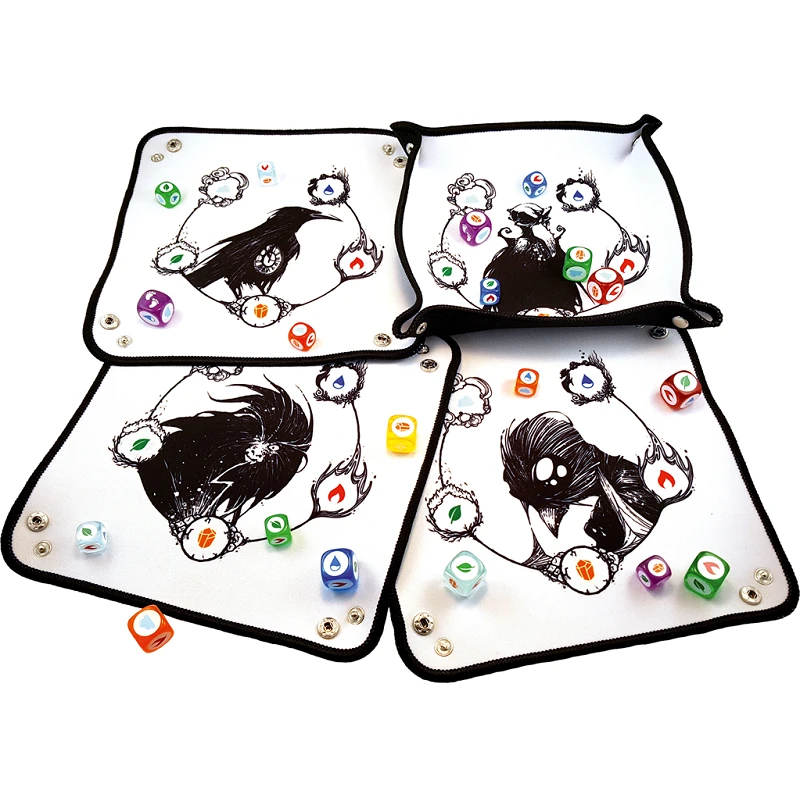 Ce pack contient quatre pistes à dés en néoprène souple. Les bords sont cousus pour plus de solidité. Elles peuvent être rangées à plat et s’assemblent grâce à de simples boutons pression. Elles sont magnifiquement illustrées par des dessins de Ben Basso le singulier illustrateur de Lueur.