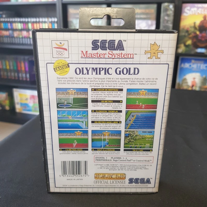 Olympic Gold : Barcelona ’92 sur Master System est le jeu officiel des 25èmes olympiades qui se sont tenues à Barcelone en 1992. Vous pourrez concourir dans sept disciplines telles que : 100m, lancer de marteau, saut à la perche, plongeon, 200m nage libre, tir à l’arc et enfin le 110m haies. Vous devrez marteler le plus rapidement possible les boutons de votre pauvre manette pour réaliser de bonnes performances.